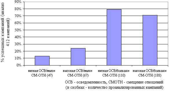 "В ходе исследования, проведенного компанией MCColum/Spielman, было установлено, что гораздо большей эффективностью обладают ролики, вызывающие повышенные ожидания к товару (смещение отношения к товару) (показатель "СМ-ОТН"), чем ролики с хорошими показателями формирования осведомленности о марке, показатель "ОСВ" (диаграмма 1).