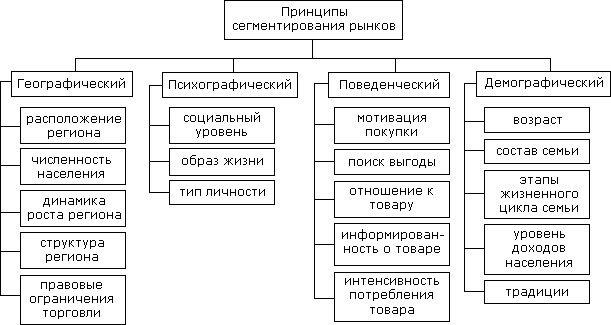 Географическое сегментирование предполагает разбивку рынка на различные географические регионы – округа, города, республики, районы. Демографическое сегментирование заключается в разбивке рынка на сегменты по таким факторам как пол, возраст, размер семьи, уровень доходов, род занятий, образование, национальность. Психографическое сегментирование предусматривает разбивку покупателей по принадлежности к общественному классу, по образу жизни, характеристике личности. Сегментирование по поведенческому принципу предусматривает разбивку покупателей на группы в зависимости от их знаний о товаре, отношений к товару, характера использования товара.