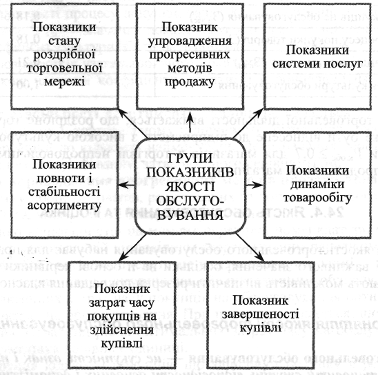 Найбільшою за кількістю оцінки показників для оцінки якості торговельного обслуговування є група показників стану роздрібної торговельної мережі. Вона включає: