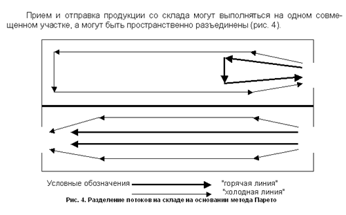 Как правило, часто отпускаемые товары составляют лишь небольшую часть ассортимента, и располагать их необходимо в удобных, максимально приближенных к зонам отпуска местах, вдоль так называемых «горячих» линий. Товары, требующиеся реже, отодвигают на «второй план» и размещают вдоль «холодных» линий. Вдоль «горячих» линий могут рас располагаться также крупногабаритные товары и товары, хранящиеся без тары, так как их перемещение связано со значительными трудностями.