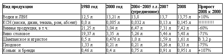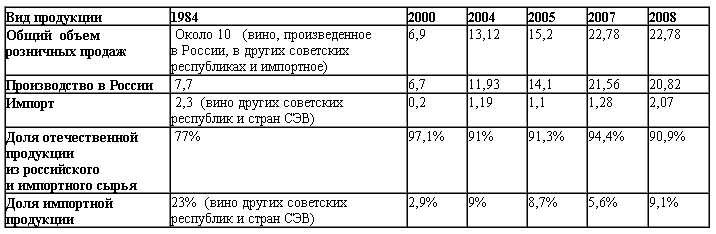 Таблица 3 - Примерная структура потребительского алкогольного рынка России в 1980., 2000 - 2008 г. г. (с учетом легального и нелегального алкоголя).