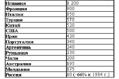 Россия на сегодняшний день занимает одно из последних мест по площади посадок виноградников среди стран - производителей винограда и виноградного вина в мире. Площади посадок в ведущих странах (Испания, Франция, Италии) составляют от 850 до 1 200 тыс. га (Таблица 1). В России площади посадок составляют всего 60 тыс. га, что на 66% меньше чем было в 1984 г. (около 185 тыс. га). Россия имеет все возможности увеличить площади посадок как минимум до показателей 1984 г. и сократить свою импортозависимость по виноградному сырью.