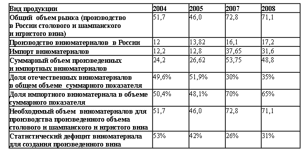 Таблица 8 подтверждает зависимость российского рынка виноградного вина (столового и шаманского и игристого) от импортных виноматериалов (сырья). Если не учитывать необходимость производства коньячных спиртов из виноматериалов, то даже в этом случае статистически доля импортного виноматериала составляет в производстве вина: 2004 г. - 50,4%; 2005 г. - 48,1%; 2007 г. - 70%; 2008 г. - 65%). А если учесть соответствие необходимого объема виноматериалов для производства произведенного в России объема столового и шампанского и игристого вина, то, например, помимо всего прочего возникает статистический дефицит виноматериала для создания произведенного вина (в 2008 г. - 31%; это доля фальсифицированного вина в России, изготовленного без применения существующего в природе виноматериала). Если бы виноматериал был более доступен по цене (то есть, его было бы больше и производство его обходилось бы дешевле), то даже вопросы фальсификации в России решались бы как в Европе: производство вина из более дешевых виноматериалов.