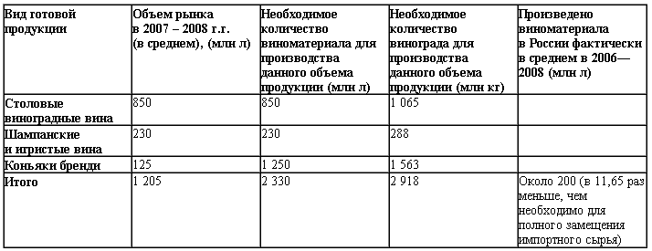 Можно рассмотреть радикальный вариант полного отказа от импортного сырья и готовой продукции и перехода на российское сырье. В этом случае даже при сегодняшнем крайне низком уровне потребления натурального виноградного вина (в три с лишним раза ниже уровня 1984 г.) России потребуется на производство столовых вин и шампанских и игристых вин не менее 1 080 млн л виноматериала и не менее 1 250 млн л виноматериала на производство коньячных спиртов для последующего производства коньяка. Итого - 2 330 млн л (для производство данного объема виноматериала необходимо не менее 2 918 млн кг винограда). В настоящее время Россия производит около 200 - 220 млн л виноматериала, то есть в 11,65 раз меньше, чем требуется для полного перевода отрасли на отечественное сырье, а потребителя - полностью на винную продукцию российских производителей (Таблица 4).