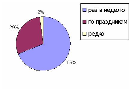 В опросе принимали участие покупатели различных возрастов, с различным материальным положением. Так из 100 опрошенных 69% покупают сдобное печенье раз в неделю, 29% - только по праздникам или дням рождениям и 2% приобретают, но очень редко, данные представлены на рисунке 2.
