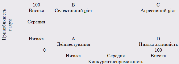 - зупинити інвестування і піти з ринку ( чи ринкового сегменту) з низькою привабливістю, де підприємство не може досягти значних конкурентних переваг.
