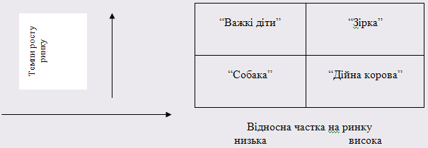 Для побудови матриці БКГ фіксуємо по горизонтальній осі значення відносної частки ринку, по вертикальній — темпів росту ринку. Далі, розділивши дану площину на чотири частини, одержуємо матрицю (рис.1.1):