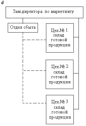 Различают централизованную и децентрализованную службу сбыта. При централизованной форме складское хозяйство административно подчиняется непосредственно руководителю отдела сбыта. При децентрализованной форме отдел сбыта обособлен от складов готовой продукции (рис. 1).