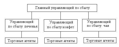 2. Товарная структура. Могут быть использованы разные варианты структуры. Основа – подразделения службы сбыта, формируемые по принципу работы и ответственности за сбыт, определенных групп, видов продукции (продукция производственно-технического назначения и товары народного потребления; продовольственные и непродовольственные товары; черные металлы, пиломатериалы, строительные материалы и т.д.) или товарных марок.