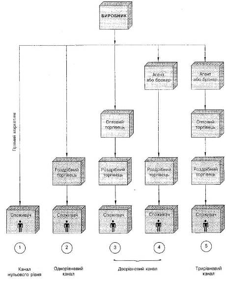 Рис. 2 ілюструє чотири альтернативні канали розподілу споживчих товарів – канал нульового рівня, одно-, дво- і трирівневий і т. ін.
