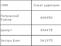 "Негосударственные статистические агентства и агентства маркетинговой информации", которые появились в последнее время (в Санкт-Петербурге "Экро" и "Гортис"), становятся серьезным конкурентом государственным источникам маркетинговой информации в силу их высокой оперативности поставки информации и высокого уровня ее формализованности (степени адаптированности поставляемого формата информации под нужды клиентов). Поставляемая ими информация по качественному, количественному и содержательному составу обычно определяется самими агентствами. Например, компания "Экро" выпускает на периодической основе журнал рейтингов и аудиторий средств массовой информации, фрагмент которого (в позиции "охват аудитории средствами массовой информации") представлен в табл. 1.2. Агентства выполняют и исследования по специальным заказам фирм, что в принципе относит их в данной позиции к классификационному уровню "внешних вторичных" источников по классификации источников маркетинговой информации.