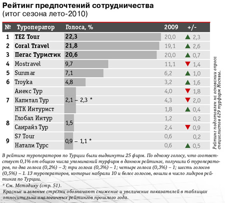 Вся тройка лидеров, контролирующая львиную долю турпотока в Турцию, прибавила «в весе». TEZ Tour по сравнению с итогами сезона-2009 получил еще 2,3% агентских предпочтений. Движение вверх считают объяснимым. «В прошлом году, сразу после кризиса, компания проводила политику сдержанности и сокращения объемов. А сейчас действует более активно, наступательно», – объяснили эксперты. Кстати, в актив TEZ Tour можно записать и успехи компании Тroyka, которую считают крупнейшим субагентом туроператора (+1,6% голосов в сравнении с летом-2009).