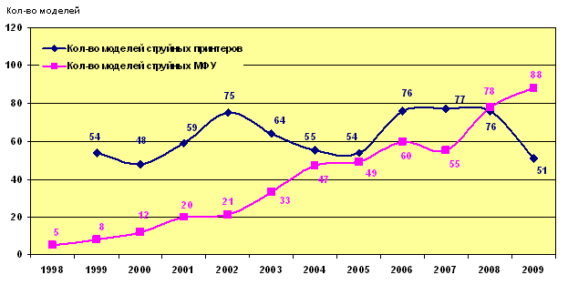Рис. 8 - Динамика ассортимента моделей струйных печатающих устройств в 1998-2009 годах