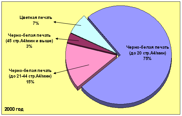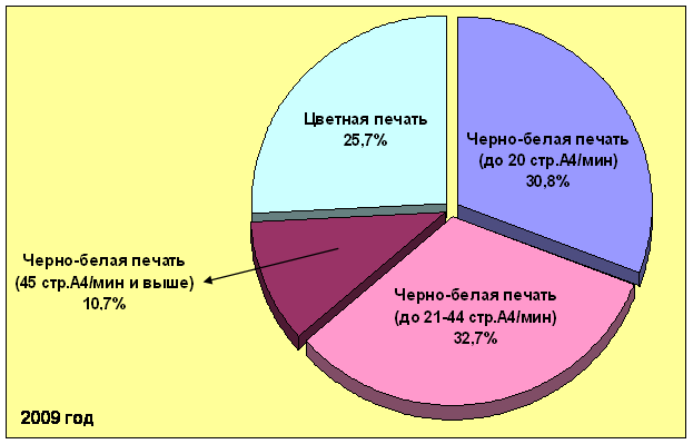 Третье - значительный рост объемов продаж цветных и скоростных черно-белых моделей, отмеченный выше, привел к тому, что сегмент черно-белых лазерных принтеров со скоростями печати до 20 стр.А4/мин перестал быть определяющим объемы продаж лазерных принтеров в целом. Уменьшение доли низкоскоростных черно-белых лазерных принтеров в период с 2000 по 2009 годы с 75% до 30.8% общего объема рынка и увеличение доли рынка цветных лазерных принтеров и МФУ в тот же период с 7.2% до 25.7% сделали объемы продаж в различных сегментах рынка сопоставимыми и равноопределяющими. (см. рис. 4).