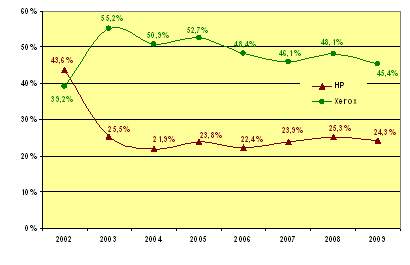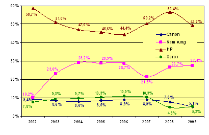 Лидерами на российском рынке лазерных принтеров являются компании (и соответствующие брэнды) HewlettPackard, Samsung, Xerox, на долю которых в 2003–2009 годах приходилось 80–83% российского рынка в ценовом выражении (см. рис.1). Соотношения долей брэндов HewlettPackard, Samsung, Xerox из года в год меняются и составляют соответственно 52–46%, 16–20%, 13–16%. Cуммарная доля лидеров в 2003–2009 годах остается относительно стабильной, что объясняется четырьмя основными факторами: «раскрученностью» брэндов (имиджем фирмы-поставщика), хорошим соотношением цена/качество для каждой из их моделей лазерных принтеров, хорошо продуманной маркетинговой политикой и хорошо развитой сетью региональных дилеров. Следует отметить, впрочем, что, хотя лидеры рынка лазерных принтеров (компании HewlettPackard, Samsung, Xerox) уверенно контролируют свою суммарную долю рынка в период 2003–2009 годов их доли в различных сегментах рынка существенно менялись.