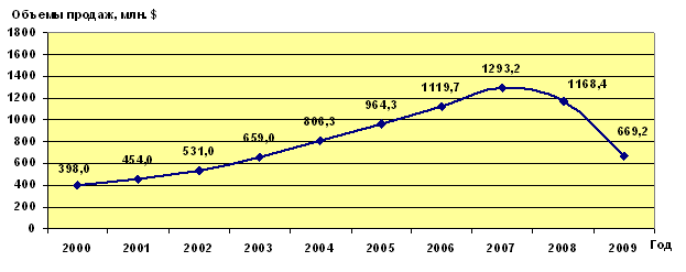 Рис. 2 - Объемы продаж лазерных принтеров (вкл. МФУ) в 2000-2009 годах (в целом)