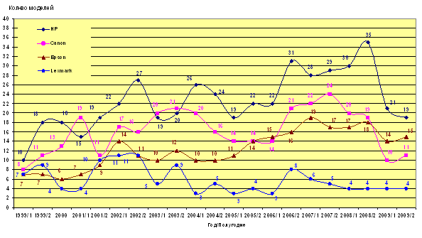 Рис. 6 - Динамика модельного ряда российского рынка струйных принтеров в 1999-2009 годах