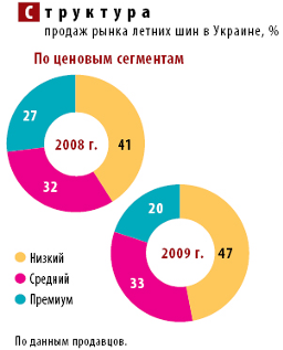 В минулому році споживач за "ім'я" переплачувати не поспішав, в результаті чого в преміум-сегменті (представлений брендами Michelin, Bridgestone, Continental, Goodyear і ін) продажу літніх шин впали на 50%. У середньому ціновому сегменті (бренди Hankook, Nokian, Pirelli, Yokohama і ін) ситуація трохи краще, падіння там становило всього 32%. Низький ціновий сегмент (бюджетний) (бренди "Росава", "Сибур Російські Шини", "Амтел", "Дніпрошина", Debica та ін) в 2009 р., в порівнянні з 2008 р., втратив 25%.