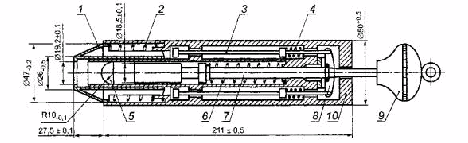 Ударный элемент состоит из головки молотка 5, пружины молотка 6, стержня молотка 7 и взводной рукоятки 9. Масса ударного элемента – (250 ± 1) г.