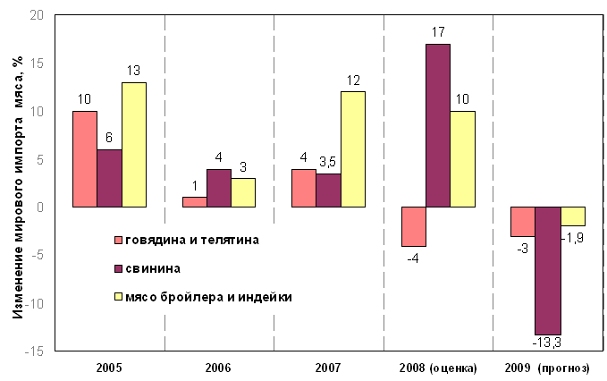 По данным Федеральной таможенной службы РФ, импорт свежего и замороженного мяса в Россию (без учета мяса птицы) в 2008 году, несмотря на действие квот и повышенных пошлин, вырос до 1619 тыс. т. с 1489 тыс. т. за 2007 год в натуральном выражении. В денежном выражении в 2008 г. этот показатель увеличился значительно сильнее – на 43,4% до $4,9 млрд. с $3.4 млрд. в 2007 году. В конце 2008 г. наблюдалось снижение объемов импорта мяса в Россию. Россия входит в число стран с самыми высокими темпами роста продовольственной инфляции в Европе.