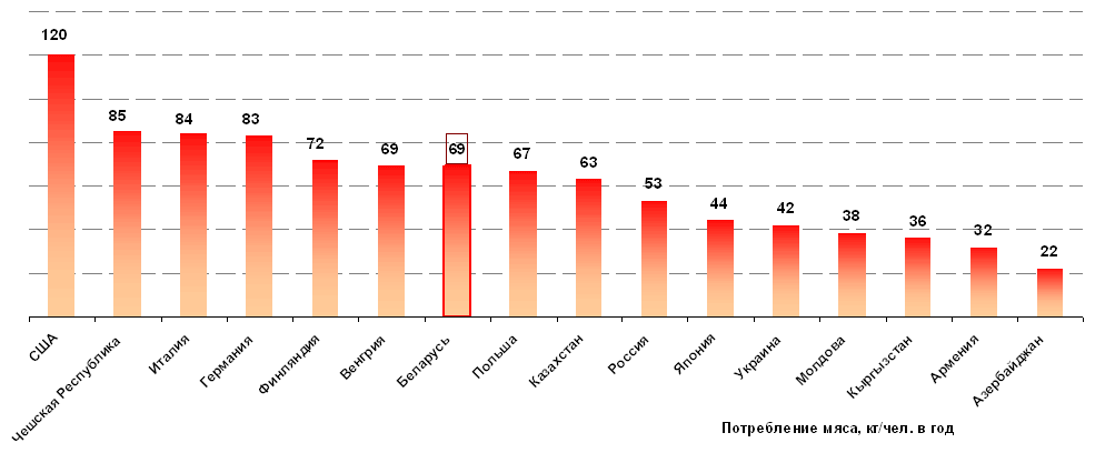 Общий рост экономики во всем мире создал условия для повышения спроса. В настоящее время потребление мяса в мире на душу населения составляет около 42 кг, при этом в развитых странах – более 82, в развивающихся – около 30 кг в год на человека. Больше всех мяса потребляют жители Соединенных штатов Америки – 120 кг на человека в год (рис. 1). Среди стран СНГ – самый высокий показатель по потреблению мяса у Республики Беларусь – в 2007 г. этот показатель составил 69 кг чел. в год.