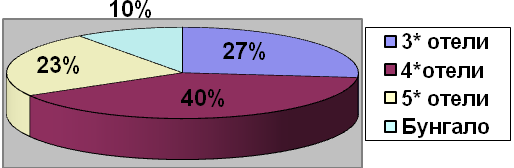 Что касается типа размещения, то большинство потенциальных туристов предпочитают 4* отели, однако это один из самых дорогих видов размещения, что, безусловно, отразится на общей стоимости тура. Осознавая это, 27% респондентов, совершая туристскую поездку в Индию, выбрали бы размещение в отелях 3*. Так же хотелось бы отметить, что 10% опрашиваемых, хотели бы остановиться в бунгало. Это не самый комфортабельный, но более экзотический вид размещения. В Индии такой тип размещения достаточно популярен, особенно на пляжах Гоа, где предлагают размещение в двух- трехместных бунгало. В каждом бунгало спальня, ванная комната, балконы с видом на океан, а также в комплекс обычно входят рестораны. Поэтому размещение в подобном бунгало не принесет потенциальным туристам неудобств (Рис.8).