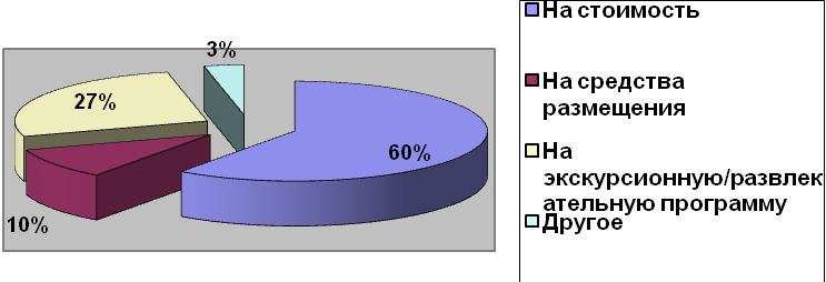 При выборе тура респонденты в первую очередь обращают внимание на стоимость путешествия (60%), что, безусловно, связанно с экономическим положением страны и достаточно высоким уровнем безработицы в связи с мировым экономическим кризисом. Всего 10% опрошенных, при выборе тура обращают внимание на средства размещения. И один человек отметил, что совершая путешествия он обращает внимание на стоимость и на популярность страны (место посещения).