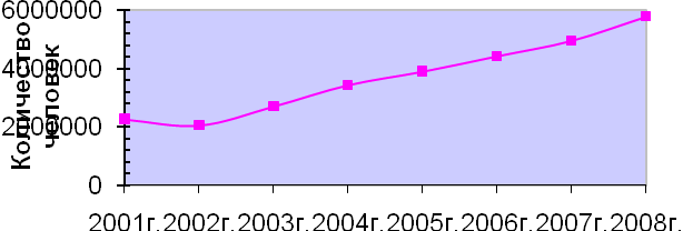 Рассматривая данный Рисунок, нельзя не обратить внимание на стремительный рост общего числа туристов за каждый год, который в среднем увеличивается на 363021 человек. В феврале 2002 года в северной Индии была зафиксирована вспышка легочной чумы (которая последний раз была в 1983 г.), вследствие этого прослеживается спад туристов из-за рубежа в Индию в среднем на 210 тысяч человек. Но уже к 2008 г. несмотря на кризис и шаткое экономическое положение стран во всем мире, количество прибывших туристов в Индию составило около 5,8 млн. человек [12].