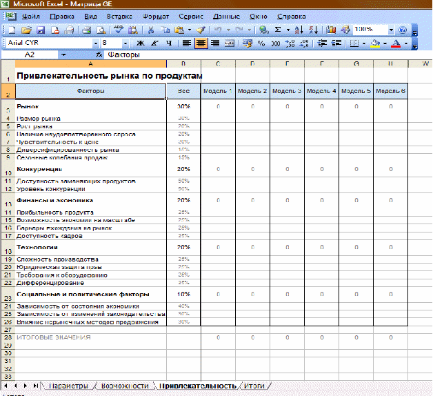 ВИД ЛИСТА «ПРИВЛЕКАТЕЛЬНОСТЬ» ДЛЯ ПОСТРОЕНИЯ МАТРИЦЫ GEM В ПРОГРАММЕ «MARKETING MIX»