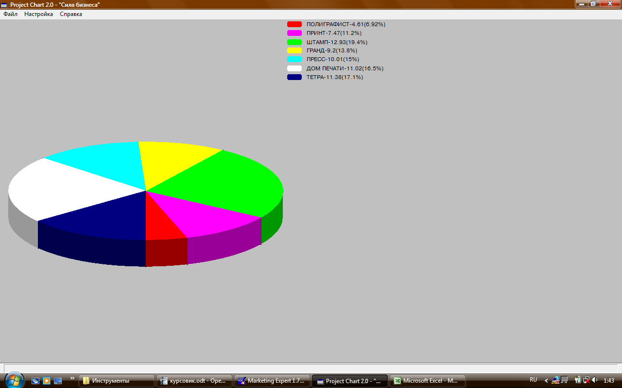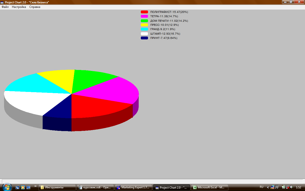 в результате SWOT-анализа в программе «Marketing Expert» была оценена сила бизнеса и относительные доли рынка, занимаемые фирмой «ПОЛИГРАФИСТ» среди своих конкурентов;