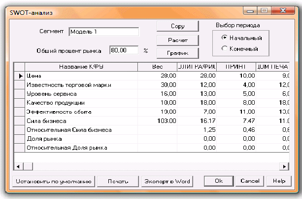Для каждой товарной группы, реализуемой данной фирмой на сегменте рынка «Малые типографии» на территории «Санкт – Петербург» в программе Marketing Expert был проведен SWOT – анализ. Результаты SWOT – анализа представлены в табл. 2-7. По значению силы бизнеса фирмы и ее конкурентов были оценены относительные доли рынка фирмы «ПОЛИГРАФИСТ» по каждой товарной группе.