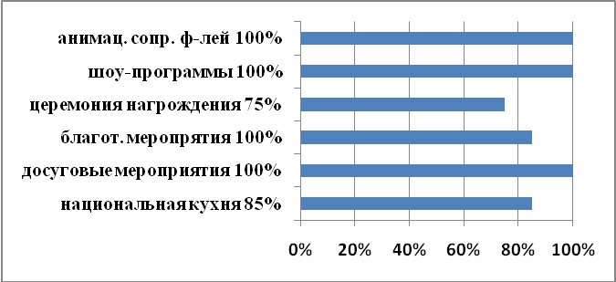 Наиболее понравившееся мероприятие, проводимое в рамках национального мероприятия Вашего города? Национальная кухня; Досуговые мероприятия; Благотворительные мероприятия; Церемония награждения; Шоу программы; Анимационное сопровождение фестивалей; другой ответ.