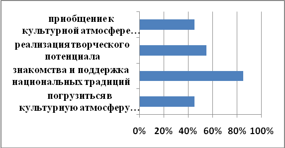 Какое удовлетворение Вы получаете в праздничных мероприятиях Вашего города? Культурно-развлекательное; Знакомство и поддержка национальных традиций; Реализация творческого потенциала; Приобщение к культурной атмосфере города; другой ответ.