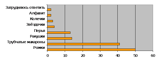 Несмотря на то, что существует достаточно широкий выбор различных видов макаронных изделий. Наиболее популярными среди населения видами макарон являются традиционные рожки и трубчатые макароны (50% и 41% соответственно). Также хорошим спросом пользуются "перья" и "ракушки" (см. рис.1):