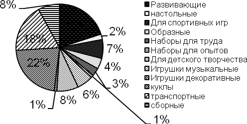 в магазине ассортимент развивающих и предметно - образных игрушек составляет большую долю, на третье место выступают транспортные игрушки.