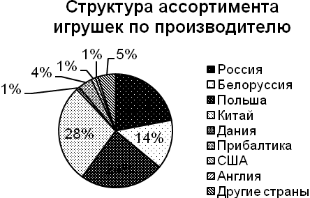 большая доля ассортимента игрушек приходится на производителей Китая, Польши, России. В магазине имеются игрушки производителей стран Западной Европы, отличающихся отличным качеством, но этих игрушек мало. Необходимо разнообразить ассортимент игрушек путем закупок игрушек из стран Западной Европы, которые отличаются по качеству;