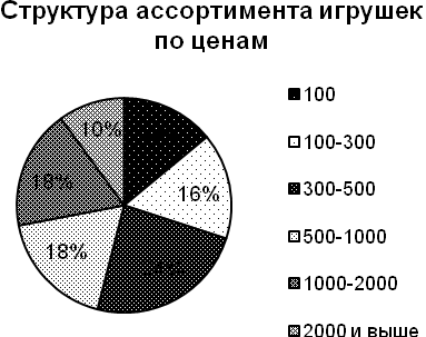 по ценам выявлено, что в основном продукция в магазине «Мир Барби» находится в таких пределах от 300- 2000 руб., самую большую долю занимают игрушки от 300- 500 руб., остальные виды игрушек занимают одинаковые доли;