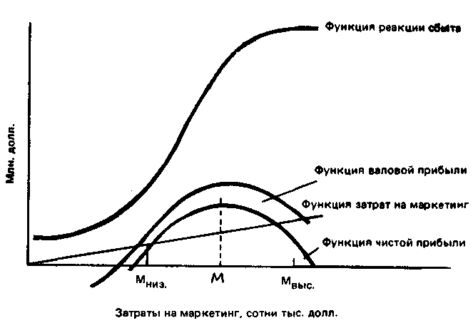 Для определения оптимального уровня маркетинговых затрат управляющий по маркетингу удаляет из функции реакции сбыта все немаркетинговые издержки и получает в результате функцию валовой прибыли. Затем функцию маркетинговых затрат представляют в виде прямой, которая начинается на нулевой отметке и идет наклонно вверх в соотношении 1 долл. маркетинговых затрат по горизонтали на каждые 10 долл. по вертикали. После этого получают функцию прибыли-нетто, вычитая функцию маркетинговых затрат из функции валовой прибыли. Функция прибыли-нетто говорит о положительной чистой прибыли при уровне маркетинговых затрат между Мнизк и Мвыс. Это и есть рациональный диапазон затрат на маркетинг. Функция чистой прибыли достигает своего максимума в точке М. Следовательно, уровень маркетинговых затрат, обеспечивающих получение максимальной чистой прибыли, должен равняться М долл.5.