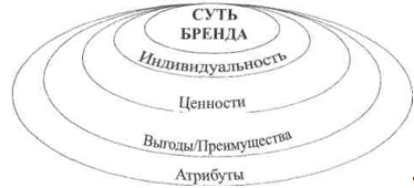 существует уникальная модель построения бренда – "колесо бренда". В соответствии с данной моделью бренд можно представить в виде набора окружностей, каждая из которых представляет отдельный элемент бренда: атрибуты, выгоды и преимущества, ценности, индивидуальность (персоналия), суть бренда.