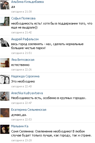 Перед тем, как запустить проект и дать ему новое рождение в стенах галереи «Культурные слои», была проведена серия опросов с целью выяснить, нуждается ли Санкт-Петербург в озеленении, необходимо ли создавать организацию/движение по озеленению города. По итогам (См. Приложение №4) автор получил ожидаемые результаты, комментарии пользователей. «Друзья» проявили повышенное внимание к проблеме, к проекту «Новая кора», выразили свои пожелания и поддержку.