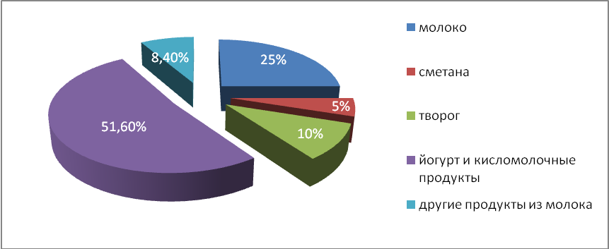 При этом среди опрошенных самыми популярными являются кисломолочные продукты и йогурт около 51,6% (31 чел.); вторым по популярности является молоко 25% (15 чел.); далее творог - 10% (6 чел); другие продукты из молока - 8,4% (5 чел.) и сметана - 5% (рисунок 2.2).