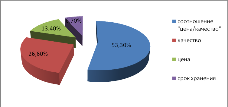 Как показали результаты опроса, в первую очередь при покупке молочной продукции потребители отдают предпочтение качеству товара 26,6% (16 чел.) и соотношению "цена/качество" 53,3% (32 чел.).