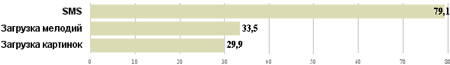 В результате анализа полученных данных выяснилось, что 79,1 % абонентов сотовой связи пользуются SMS. Треть опрошенных (33,5 %) загружает в свой телефон мелодии, и чуть меньше - 29 % пользуется услугой загрузки картинок.