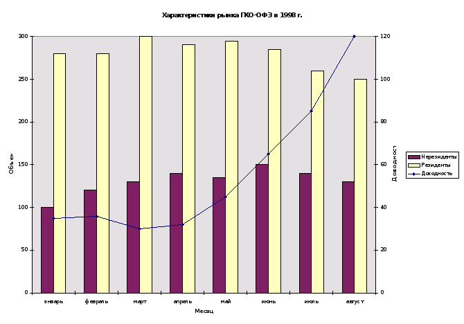 В 1997-1998 году обладающими наиболее привлекательными характеристиками: высокой доходностью(доходившей в отдельные дни до 110-120 процентов), надежностью и ликвидностью были ГКО-государственные краткосрочные облигации. Для многих банков поддержание крупного пакета ГКО было единственным способом выйти на требуемый уровень капитализации к 1999 году. Рынок ГКО с его льготной системой налогообложения (15 процентов) оставался таким образом, чуть ли не единственной возможностью банков увеличить капитализацию. По мере развития рынка все большая доля активов российских банков оказывалось размещенной в ГКО. Банками инвестировавшими наибольшие средства в государственные краткосрочные облигации являются Сбербанк -54,7%; «ОНЭКСИМбанк» - 11,6%; «Ак Барс» банк -8,4%.