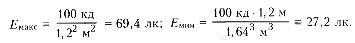 Дано: H = 1,2 м, I = 100 кд, a = 2 м, b = 1 м. _________ Eмакс – ? Eмин – ? Решение |