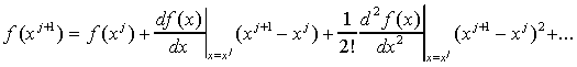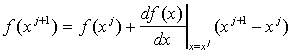 Теперь предположим, что справедливо необязательное допущение того, что предыдущее приближение xj было удовлетворительным, так что xj+1 - xj мало. Если это предположение верно, мы можем пренебречь членами более высокого порядка в уравнении (3), так как n-я степень малой величины значительно меньше, чем малая величина для n>=2. В этом случае уравнение (3) может быть аппроксимировано следующим образом:
