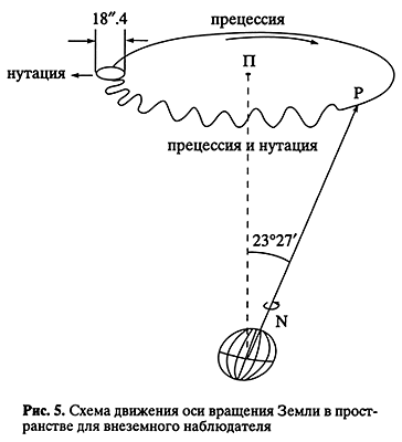 Моменты сил притяжения, действующие на экваториальные вздутия, меняются в зависимости от положения Луны и Солнца по отношению к Земле. Когда эти планеты находятся в плоскости земного экватора, моменты сил исчезают, а когда склонения Луны и Солнца максимальны, то величина момента наибольшая. Вследствие таких колебаний моментов сил тяготения наблюдаются нутации (от лат. nutatio - колебание) оси вращения Земли, складывающиеся из ряда небольших периодических колебаний. Главнейшее из них имеет период 18.6 года - время обращения узлов орбиты Луны. Движение с этим периодом происходит по эллипсу. Большая ось эллипса перпендикулярна направлению прецессионного движения и равна 18".4; малая параллельна ему и равна 13".7. Таким образом, ось вращения Земли описывает на небесной сфере волнообразную траекторию, точки которой находятся на угловом расстоянии в среднем около 23°27' от полюса эклиптики (рис. 5).