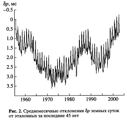 В приливных колебаниях скорости вращения Земли выделяются составляющие с периодами в год, полгода, 13.7; 27.3; 9.1 суток. Спектральный анализ 350-летнего ряда среднегодовых значений дает максимум спектральной плотности на периоде около 70 лет. Колебание с этим периодом особенно заметно проявлялось в последние 150 лет. В начале XX в. амплитуда 70-летнего колебания достигала 2 месяцев.