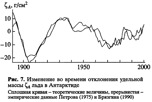 Исходя из этого можно составить систему алгебраических уравнений, связывающих величину скорости вращения Земли и координаты полюса с массами льда в Антарктиде, Гренландии и воды в Мировом океане. Эти уравнения позволяют вычислять характеристики вращения Земли - координаты полюса и скорость вращения Земли. Если же массы льда неизвестны, но имеются данные о нестабильностях вращения Земли, то можно решить обратную задачу: по координатам полюса и скорости вращения вычислить ежегодные значения масс льда в Антарктиде, Гренландии и воды в Мировом океане. К сожалению, мы не смогли сопоставить ряды вычисленных масс льда в Гренландии и воды в Мировом океане с данными наблюдений из-за отсутствия последних. Лишь для Антарктиды удалось сопоставить вычисленную кривую изменений массы льда с наблюденной (рис. 7). Качественное согласие кривых оказалось таким, что связь многолетней неравномерности вращения Земли с флуктуациями глобального во-дообмена кажется возможной. Однако вычисленные колебания глобального водообмена почти в 29 раз больше наблюдаемых.