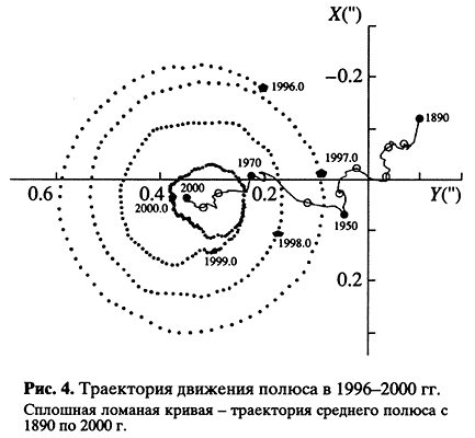 Изменяется не только угловая скорость Земли. Наша планета совершает небольшие колебания относительно оси вращения. Поэтому движутся точки, в которых ось пересекает земную поверхность (мгновенные полюса Земли). Они перемещаются по земной поверхности вокруг среднего полюса в направлении вращения Земли, то есть с запада на восток. Траектория движения полюса имеет вид спирали, которая периодически то закручивается, то раскручивается. Для примера на рисунке 4 показана траектория движения мгновенного Северного полюса за 1996-2000 гг. Его максимальное удаление от среднего отмечалось в мае-июле 1996 г. Затем полюс стал закручиваться, и это продолжалось до 2000 г., когда он подошел на минимальное расстояние к центру спирали. Сейчас полюс раскручивается и удаляется от своего среднего положения.